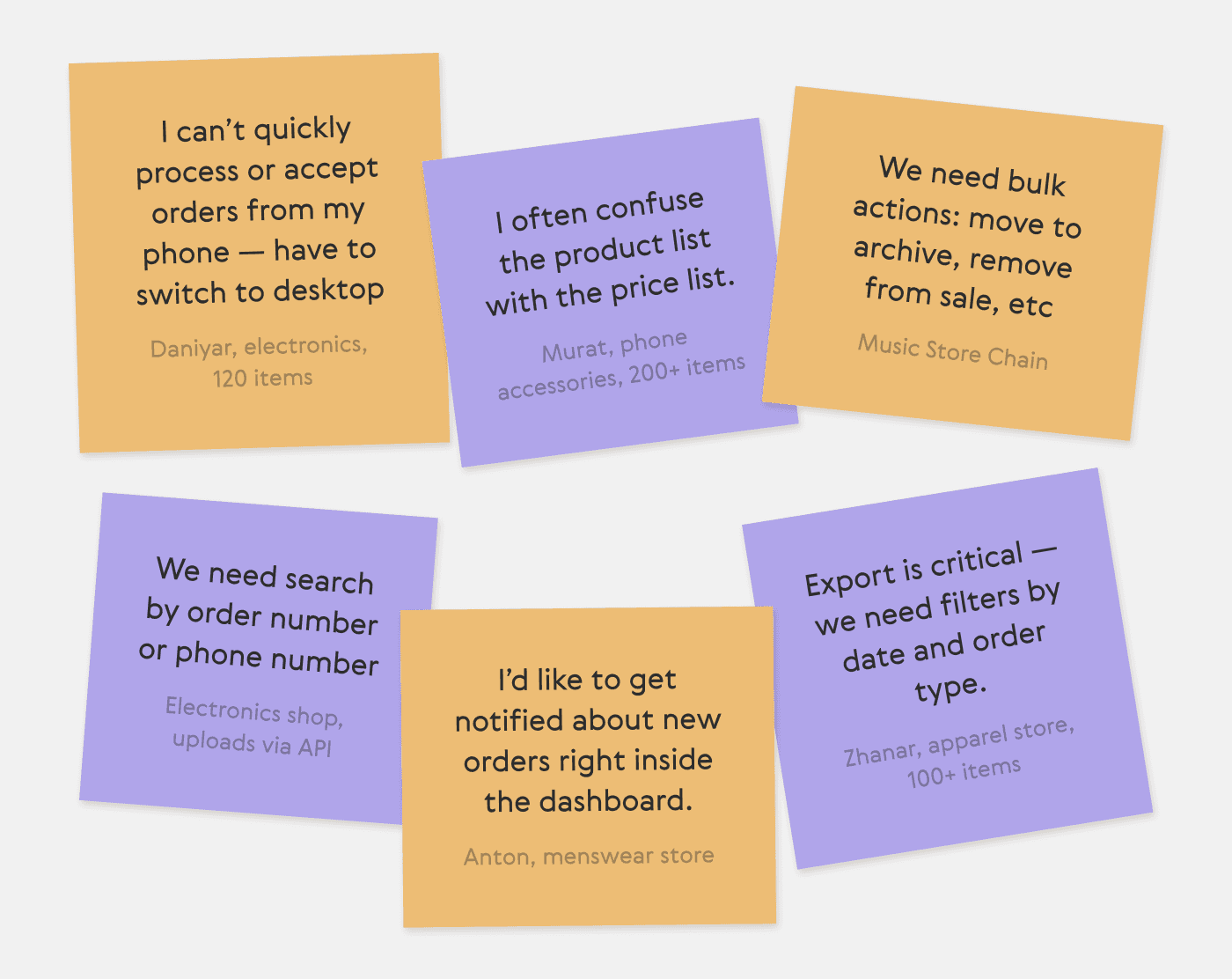 All of them regularly used the seller dashboard to manage orders, products, and delivery. This helped identify key pain points and priorities for the redesign. Below — direct quotes from respondents: