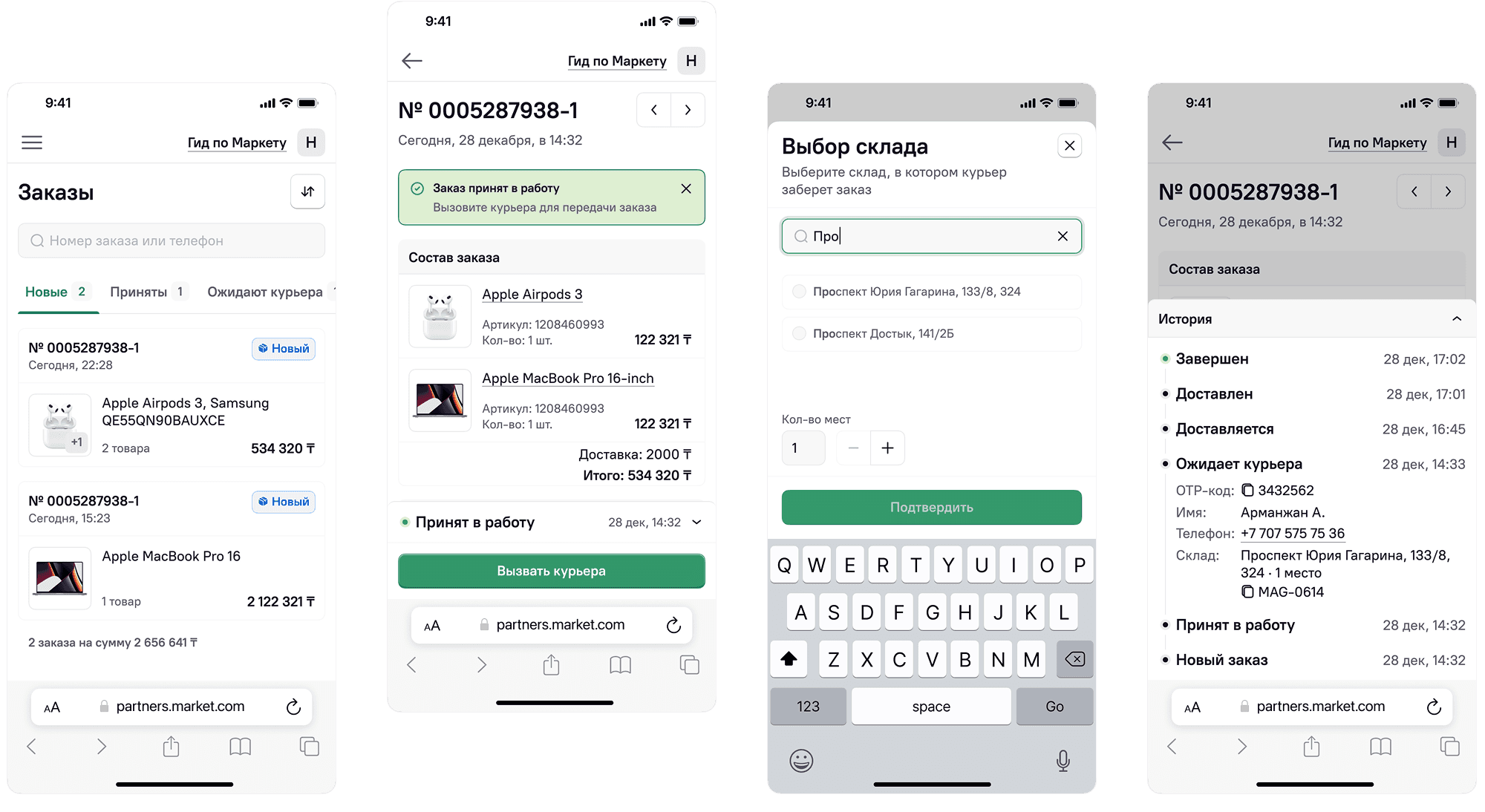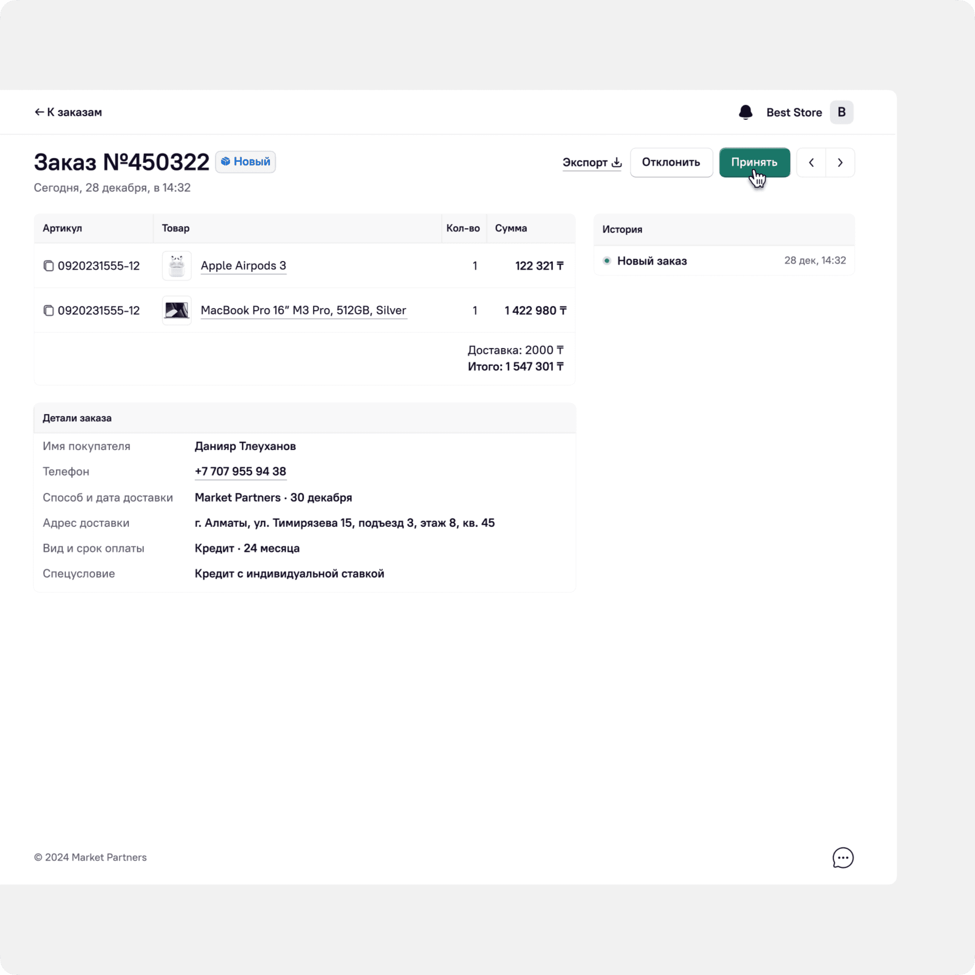 The order screen is focused on the main scenario — checking and accepting orders.