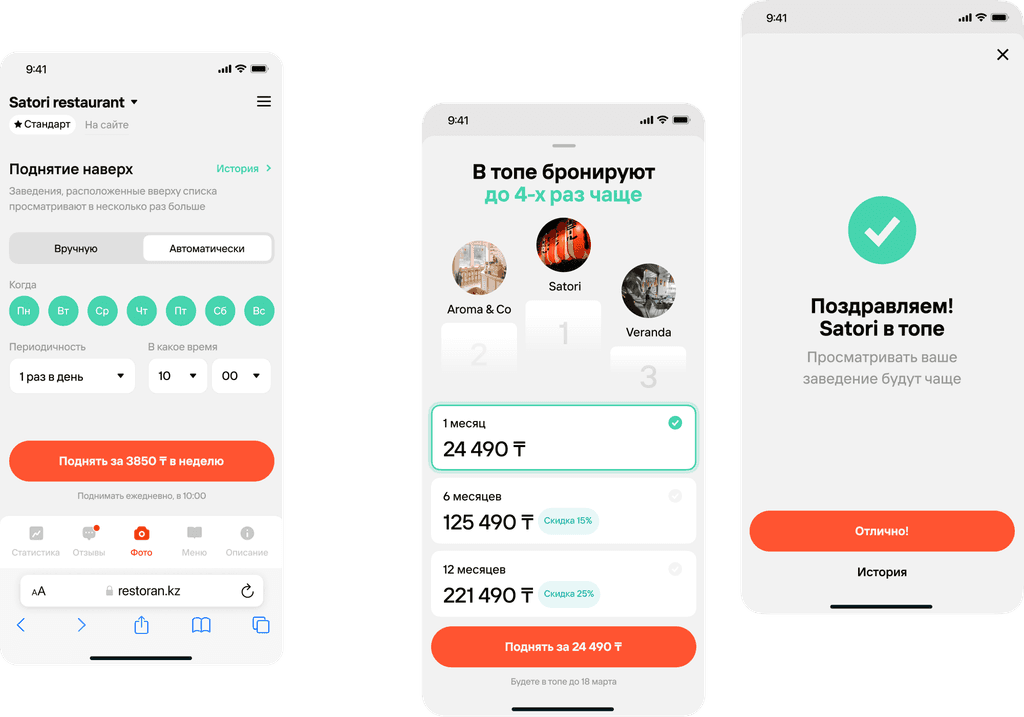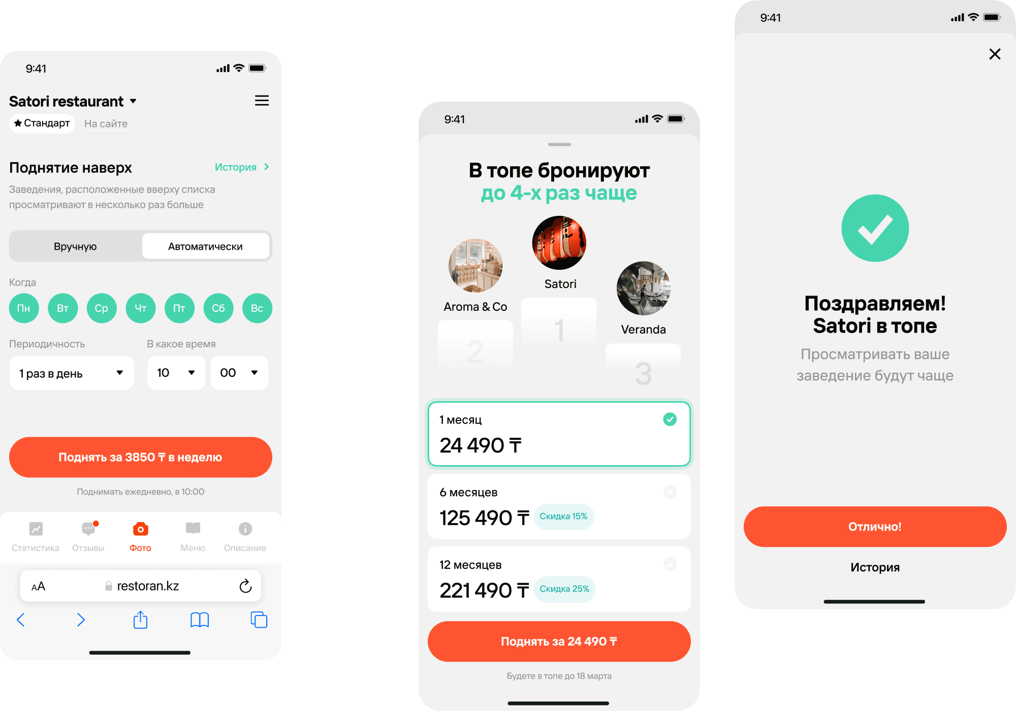 We gave managers full control over their menu, letting them add and update dishes in real time. To help restaurants get noticed, we introduced the “Boost to Top” feature — venues that appear at the top of search results receive up to 4x more bookings, making this feature a high-impact tool for increasing visibility and revenue.