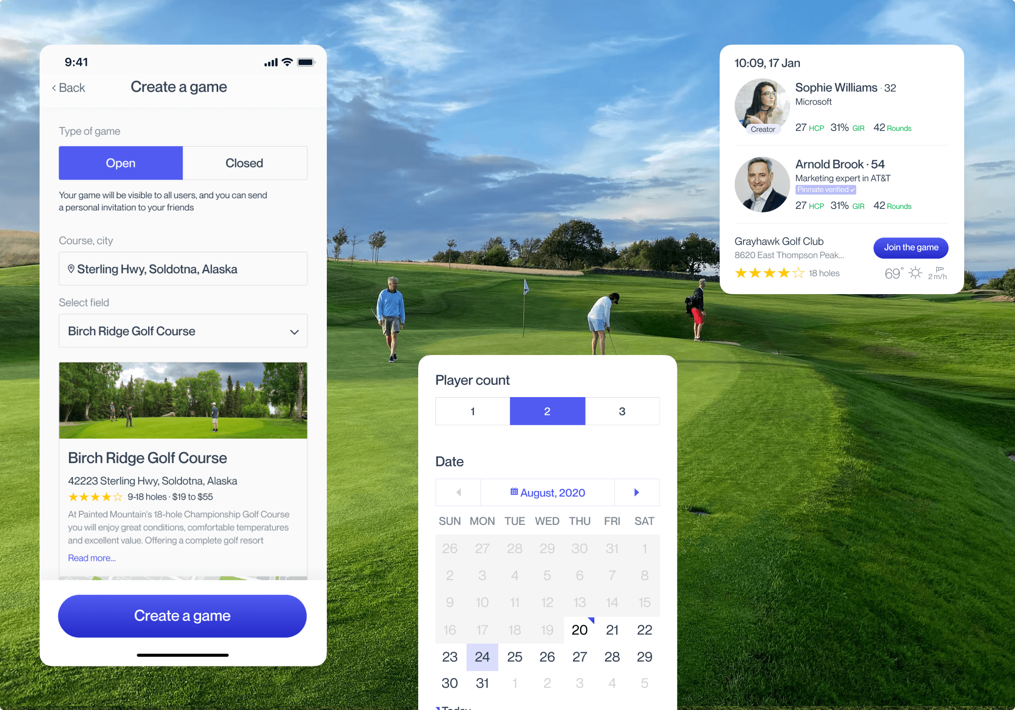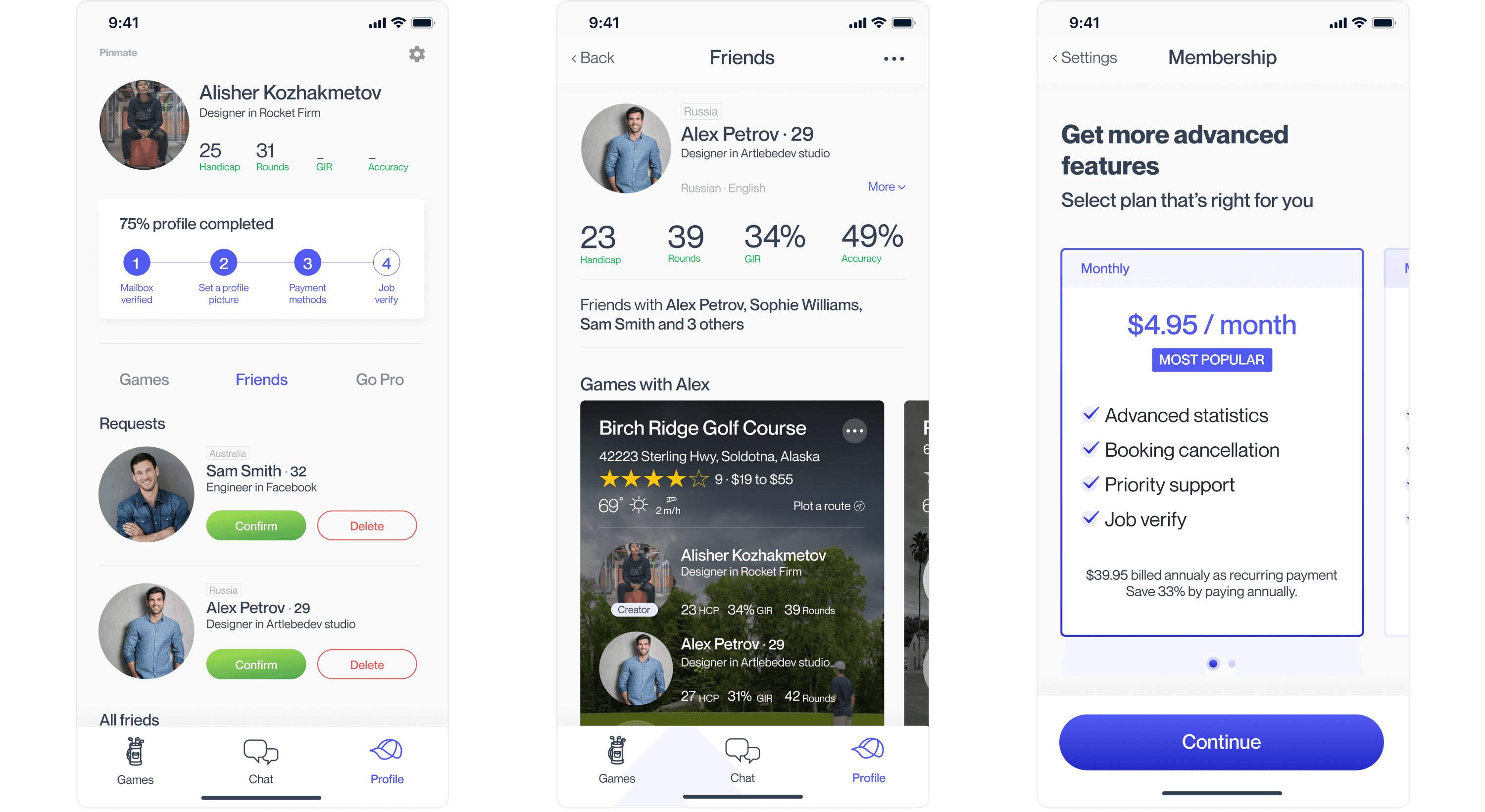 Профили пользователей отображают имя, профессию, гольф-статистику и прогресс заполнения. Друзья добавляются по запросу, также можно увидеть историю совместных игр с каждым игроком.