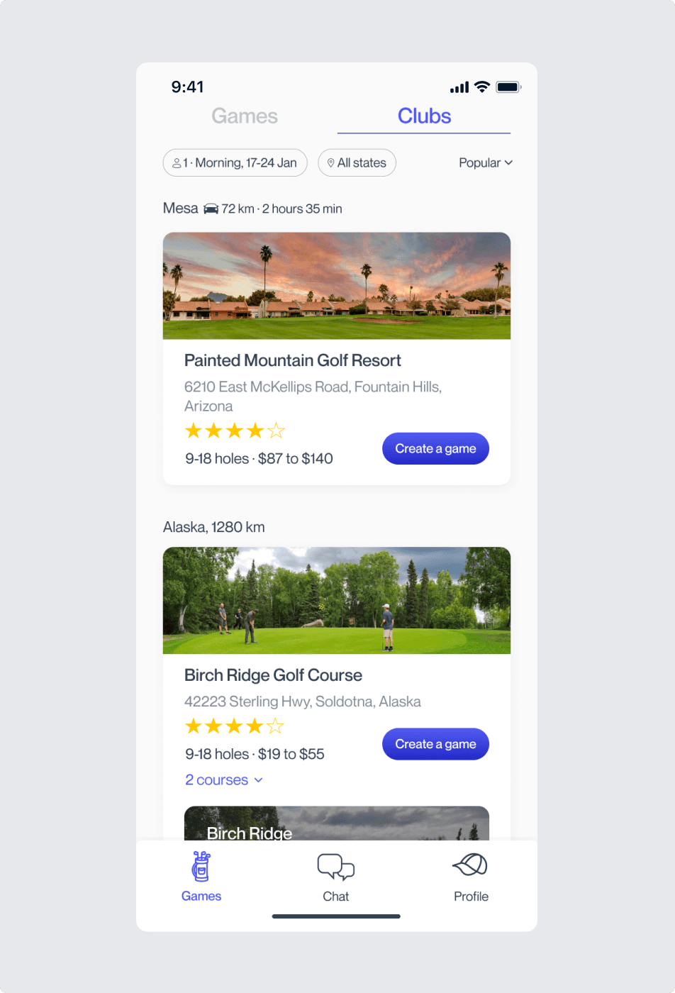 Вкладка «Клубы» позволяет пользователям выбрать площадку до создания матча — с фильтрами по дате, времени и региону. Встроенный чат помогает заранее согласовать детали. Каждая карточка матча показывает ключевую информацию: площадку, погоду, рейтинг организатора и статистику игры — всё, что нужно для быстрого решения.